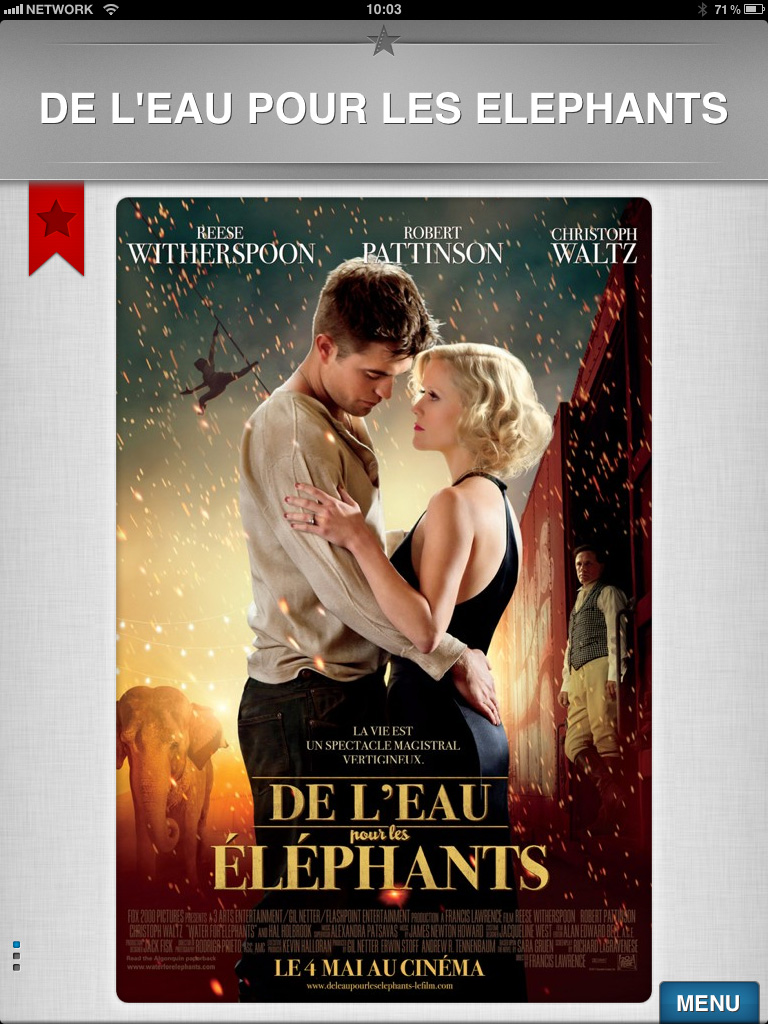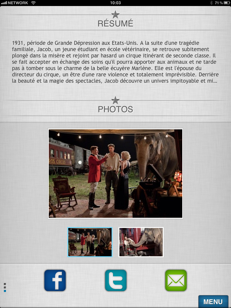L'application iPad tire parti du plus grand écran des PC tablettes, par rapport aux autres appareils mobiles. Des affiches sont présentées dans un format plus grand et de nombreuses bandes -annonces sont disponibles en qualité HD.